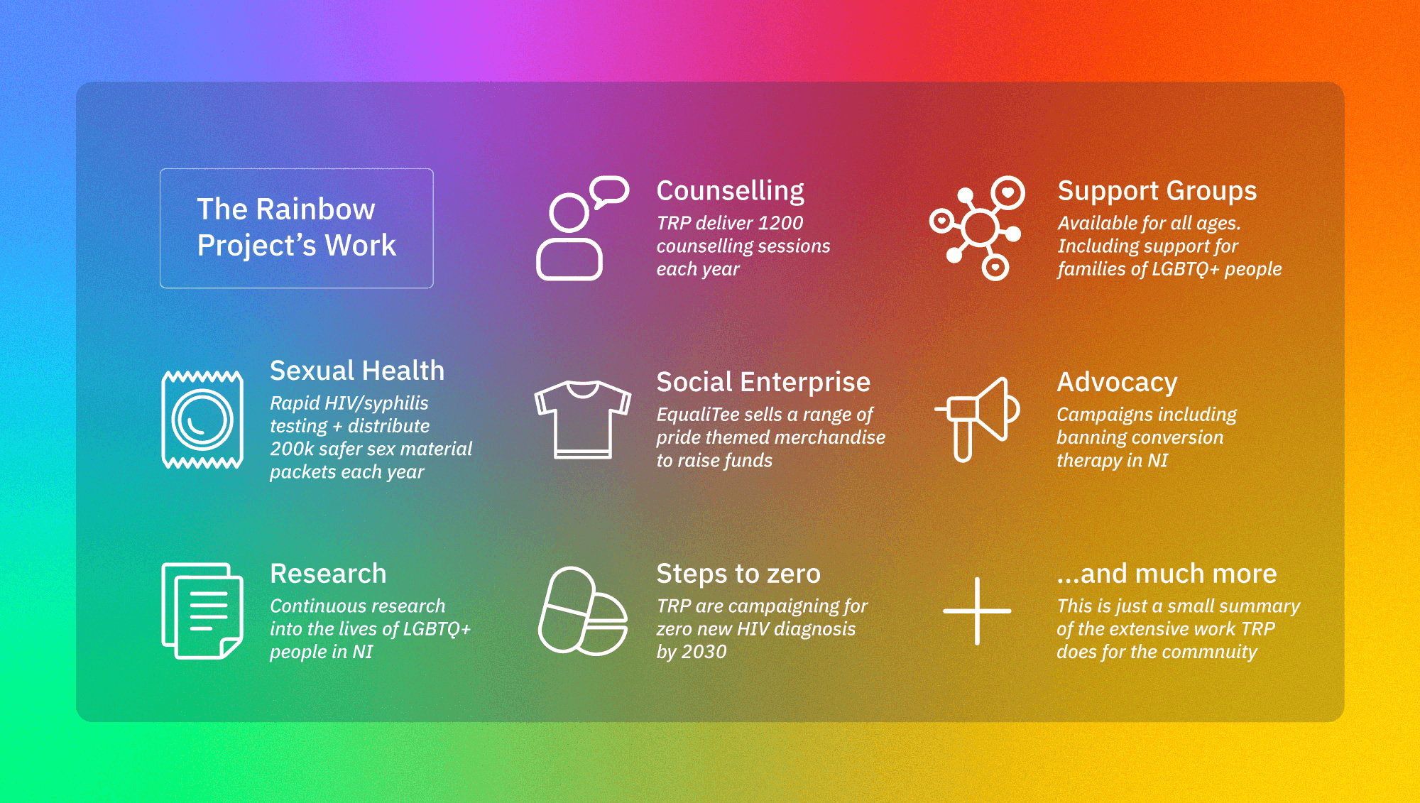 The Rainbow Project works continuously to improve the lives of LGBTQ+ people in Northern Ireland. This includes working directly with LGBTQ+ people to offer counselling, impacting legislation, sexual health testing and promoting education. While the charity alone cannot undertake every single issue that must be addressed until LGBTQ+ are equal members of society, TRP’s work has helped Northern Ireland make significant strides in the right direction. The main areas of focus for the organisation are set out below.