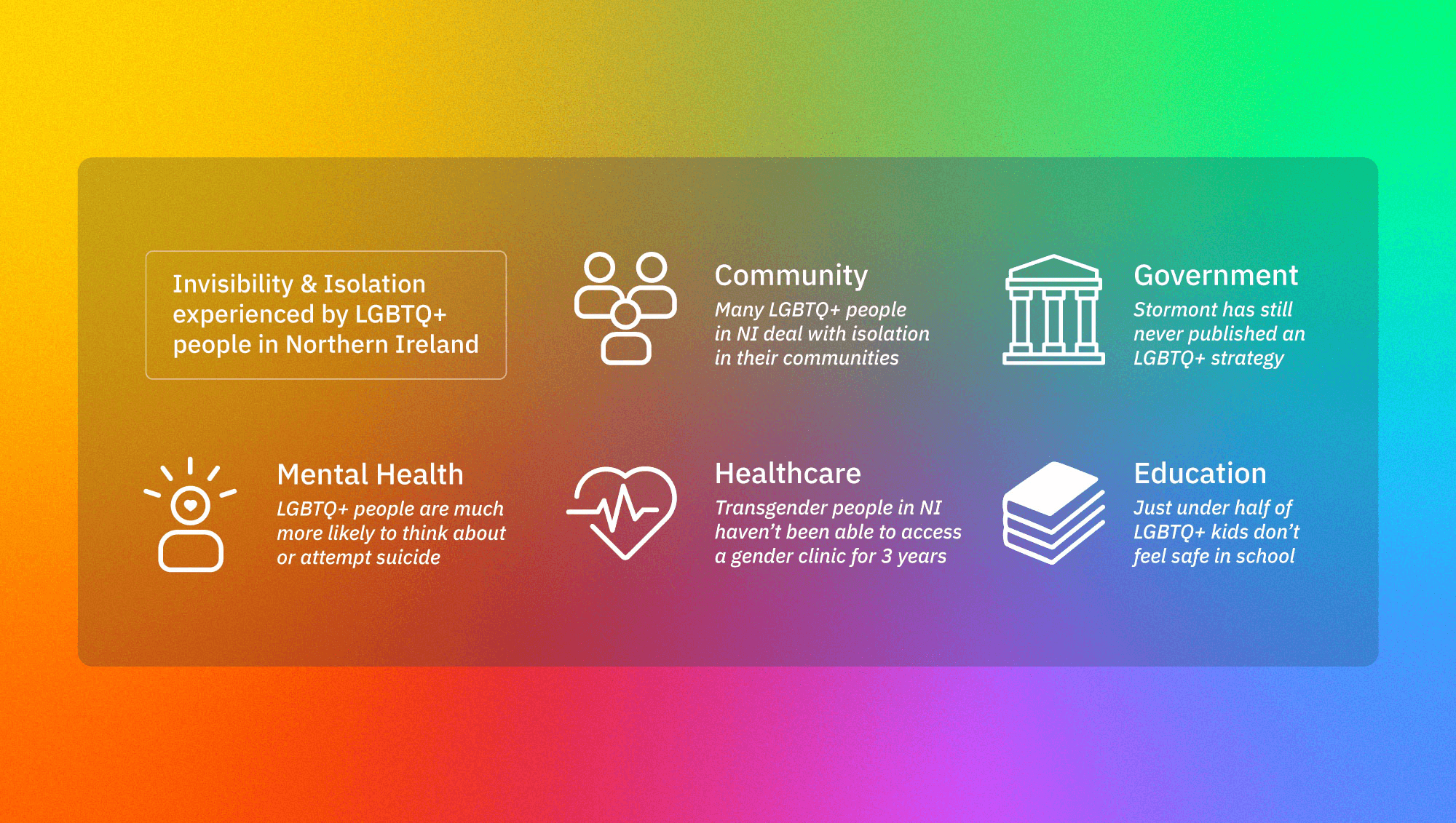 Two of the biggest issues The Rainbow Project see experienced throughout the LGBTQ+ community are invisibility and isolation. These issues manifest themselves across every aspect of an LGBTQ+ persons life.